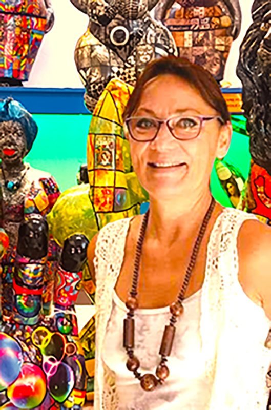Elle explique : « Toute petite, je remplissais des feuilles de papier d’une multitude de taches de couleurs jusqu’à ne plus voir de blanc. J’adorais ces explosions de couleurs. Plus tard, je me suis intéressée à l’association de coupures de papier pour en faire des tableaux. Mais, c’est au cours de mes séjours en Afrique que j’ai découvert différents artisanats et ai été attirée par les sculptures en bois. Couleurs, papier, sculptures… il n’en fallait pas plus pour que naisse ma passion du « paper art » sur sculptures. » L’artiste sculptrice travaille dans son atelier de Saint-Louis de Marie-Galante, petite île au sud de la Guadeloupe, où elle vit désormais. Ses créations cherchent à transmettre des sentiments et à offrir du bonheur en couleur à celles et ceux qui s’attardent devant elles, le temps d’une pause créative dans des journées agitées.