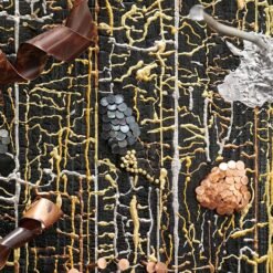 Technique : Pin brulé et stabilisé, Peinture à la seringue de vernis acrylique. Etain fondu. Semences de tapissier cuivre et acier bleui. Plaque cuivre, clou laiton, cuivre, acier