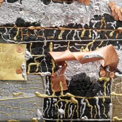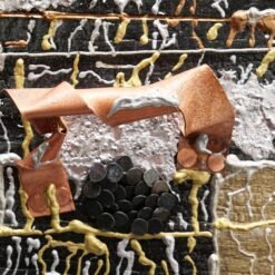 Technique : Pin brulé et stabilisé, Peinture à la seringue de vernis acrylique. Etain fondu. Semence cuivre. Plaque cuivre et laiton.