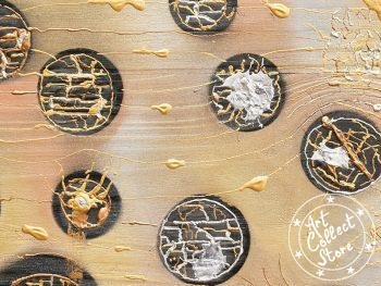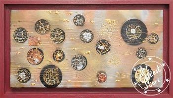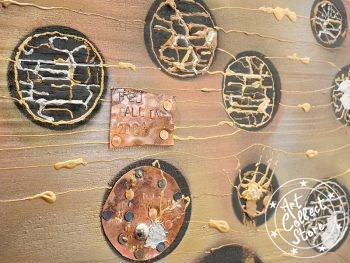 Technique : Pin brulé et stabilisé, Peinture à la seringue de vernis acrylique. Etain fondu. Plaque cuivre et laiton