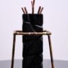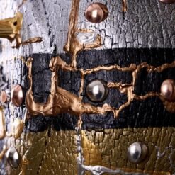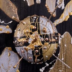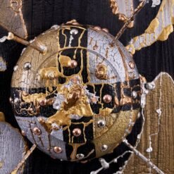 Technique : Pin brulé et stabilisé, peinture à la bombe sur pochoir, bol brulé clou de charpentier et tourillons. Peinture à la seringue vernis acrylique. Plaque cuivre recuit et frappée