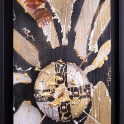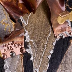 Technique : Pin brulé et stabilisé, peinture à la bombe sur pochoir, bol brulé clou de charpentier et tourillons. Peinture à la seringue vernis acrylique. Plaque cuivre recuit et frappée