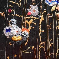 Technique : Pin brulé et stabilisé, Peinture à la seringue de vernis acrylique. Peinture pourring. Etain fondu, semence de tapissier, plaque cuivre recuit