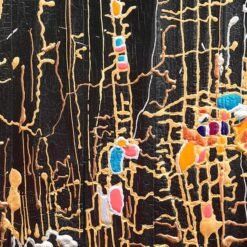 Technique : Pin brulé et stabilisé, Peinture à la seringue de vernis acrylique. Peinture pourring. Etain fondu, semence de tapissier, plaque cuivre recuit