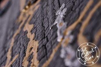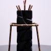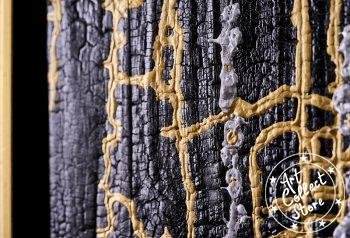 Technique : Pin brulé et stabilisé, Peinture à la seringue de vernis acrylique. Etain fondu. Semences de tapissier cuivre et acier bleui. Plaque laiton