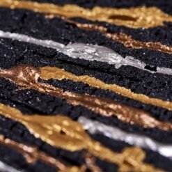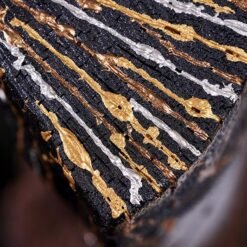Technique : Chéne brulé et stabilisé. Peinture à la seringue vernis acrylique, etain fondu, plaque de cuivre frappé, recuit. Base pierre rouge du Portugal