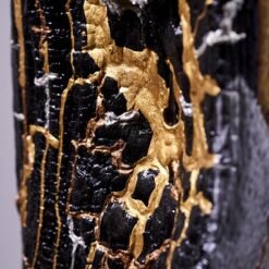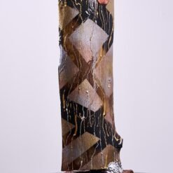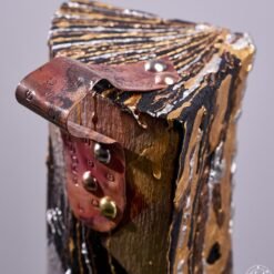 Technique : Chéne brulé et stabilisé. Peinture à la seringue vernis acrylique, etain fondu, plaque de cuivre frappé, recuit. Base pierre rouge du Portugal
