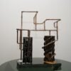 Technique : Pin brulé et stabilisé, Peinture à la seringue de vernis acrylique. Etain fondu, plaque cuivre et laiton recuit, clou charpentier, cable audio semence de tapissier en cuivre