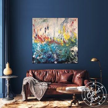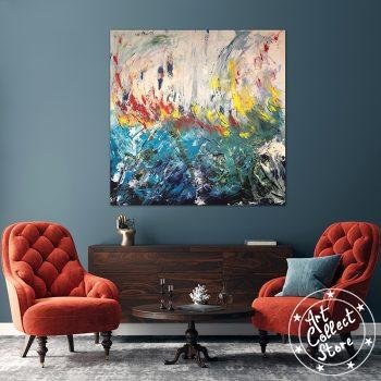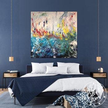 Kloo : Cette grande toile m’a été inspirée durant le confinement. Une succession de nouvelles catastrophiques entraient dans nos vies et usaient nos forces. Je voulais lutter contre la morosité générale. Cette grande toile immaculée me sembla un beau terrain d’optimisme à proposer.Je me suis jetée sur mes couleurs et j’ai composé ce tableau qui est un appel à la vie avec ce qu’elle a de magnifique, de joyeux de si fort ! La vie quoi !