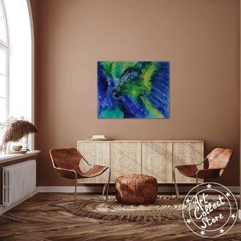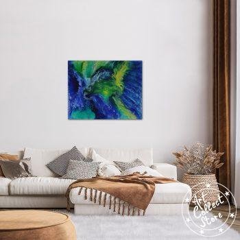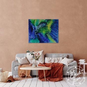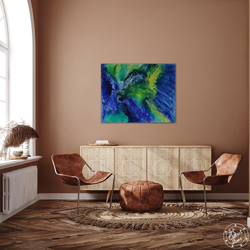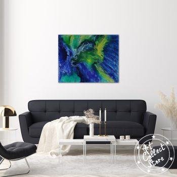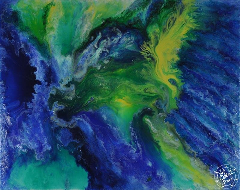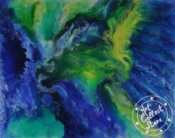 Technique : Résine et fibre de verre sur toile. Dominance des pigments bleus verts et jaune