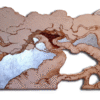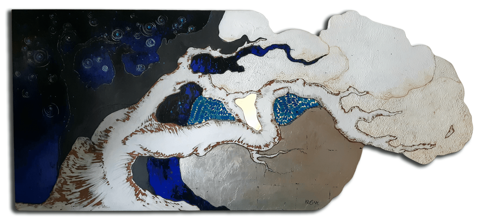 Technique mixte sur bois découpé et scarifié. Acrylique/ dorure à la feuille / résine / verre / rétro-éclairage leds,