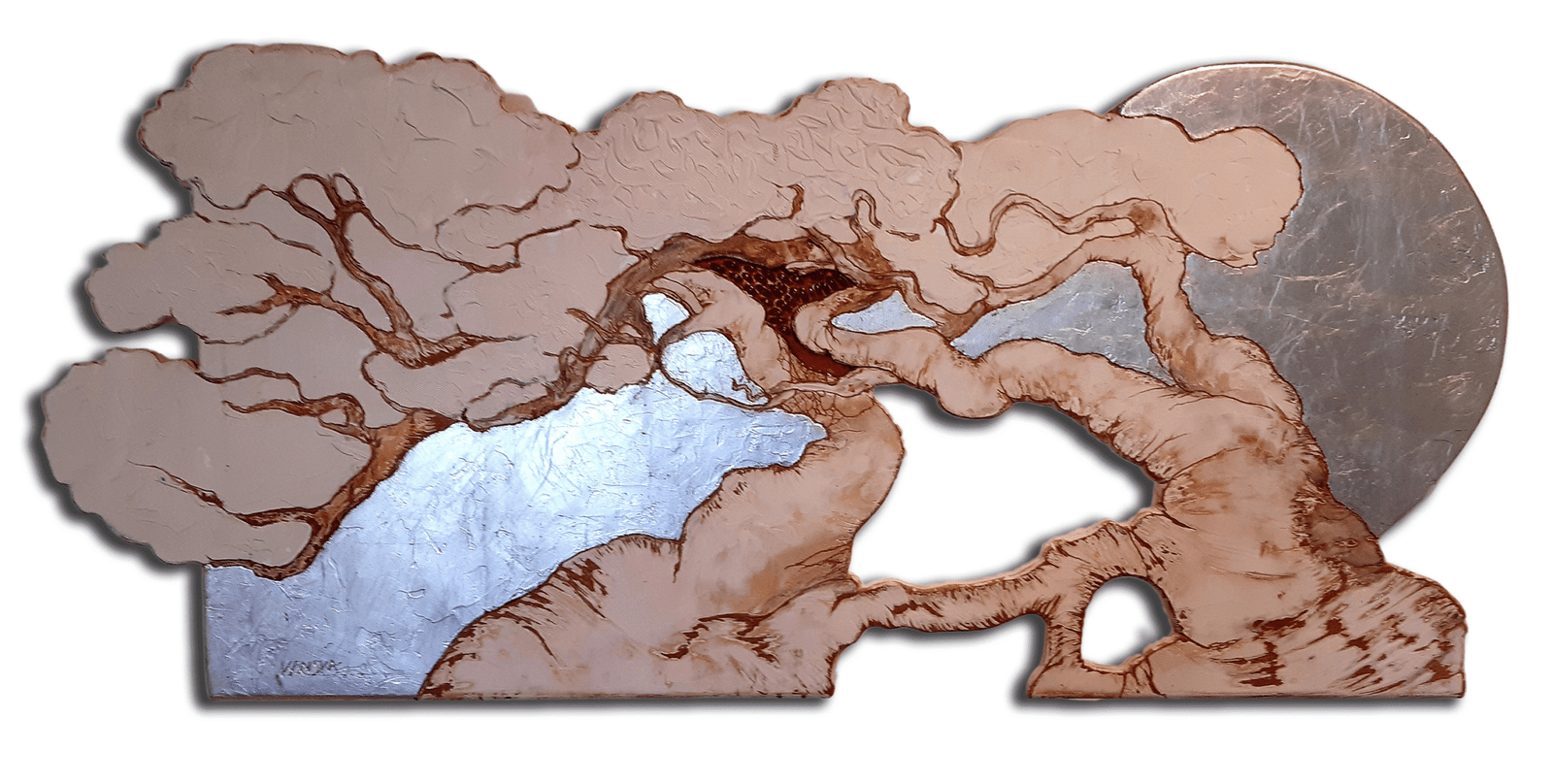 Technique mixte sur bois découpé et scarifié. Acrylique / dorure à la feuille / résine / verre / rétro-éclairage leds.
