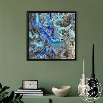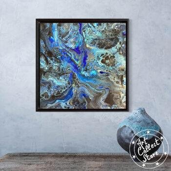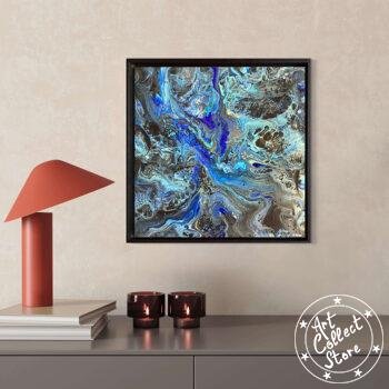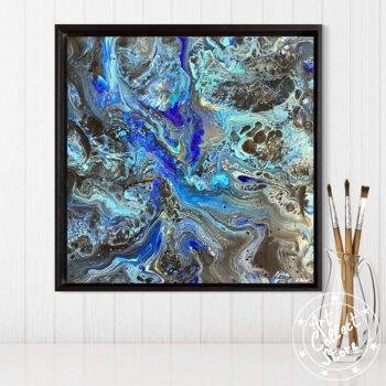 Cette œuvre présente un tourbillon de couleurs avec une prédominance de tons bleus et noirs, mêlés à des touches de blanc et de gris, ainsi que quelques nuances d’argent métallique. Elle est caractérisée par un aspect marbré et des motifs abstraits qui rappellent des formations rocheuses ou des courants d’eau vus d’en haut. La texture est riche et complexe, offrant une impression de profondeur et de mouvement