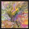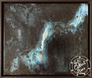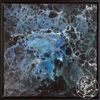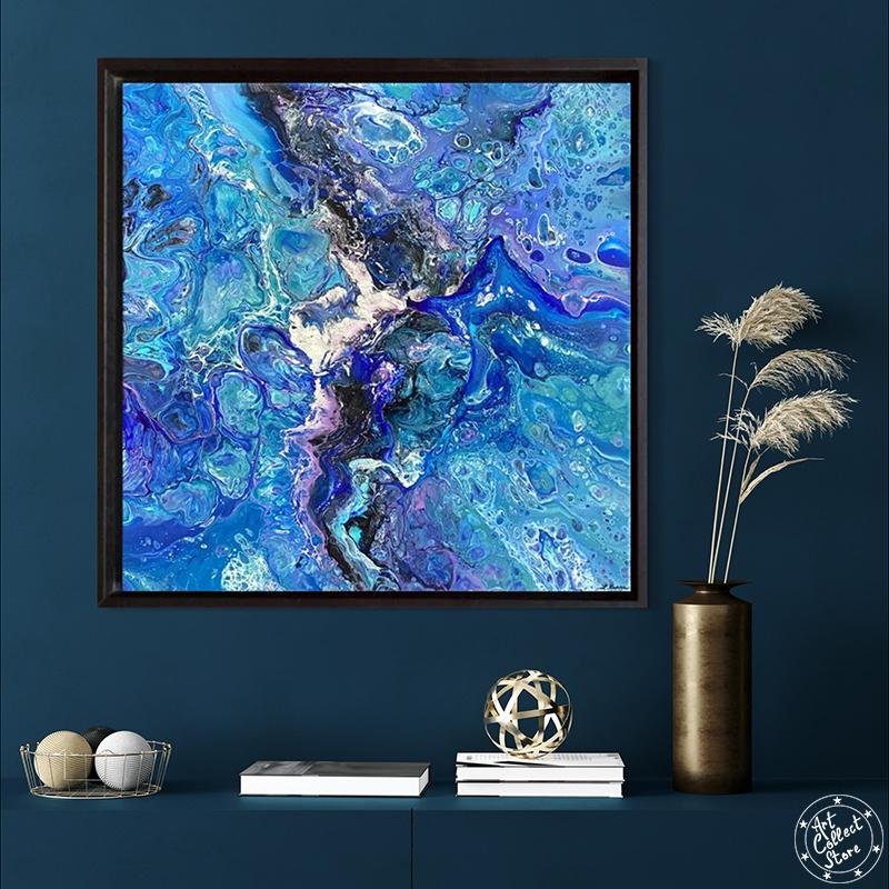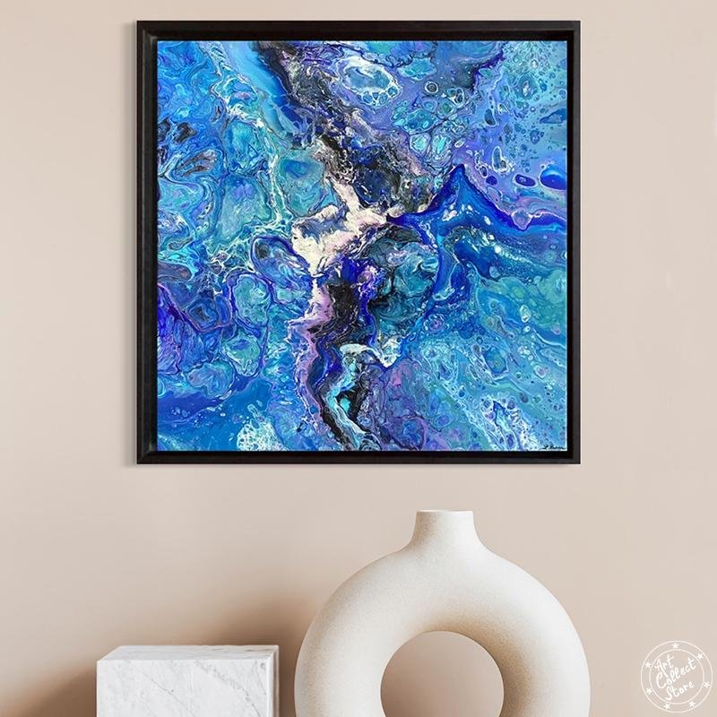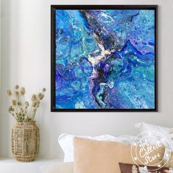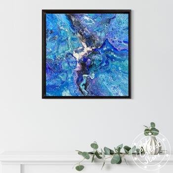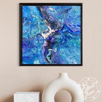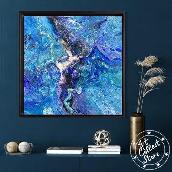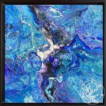 Cette œuvre d’art abstraite est très colorée, dominée par une palette de bleus et de violets, avec des touches de blanc et de noir qui ajoutent du contraste. La texture ressemble à un mélange fluide de peintures avec des motifs qui pourraient rappeler ceux d’un tourbillon ou d’une marbrure. L’ensemble donne une impression de mouvement et de profondeur, comme si l’on regardait un océan agité de près, ou peut-être même à travers un microscope pour observer une réaction chimique colorée.