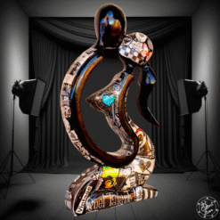 Siberil Rey : Cette statue en bois est sculptée à la main et habillée d’une multitude de papiers coupés à façon. Sa robe noire et blanche est ponctuée de patchs colorés