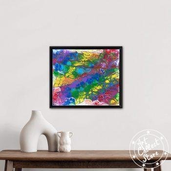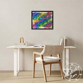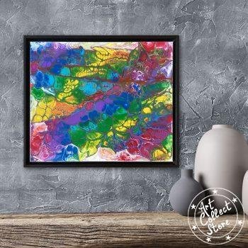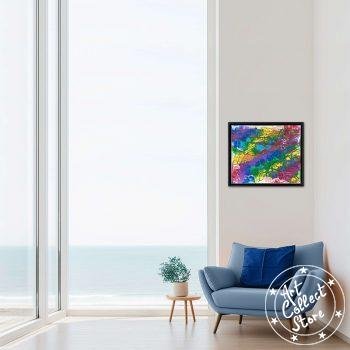 Sur la toile, « Rainbow », une explosion de couleurs. Rouge, orange, jaune, vert, bleu, violet : l’arc-en-ciel danse. Chaque teinte se mêle, créant une harmonie vibrante. Un tableau vivant, une invitation à se perdre dans la magie des couleurs qui s’entrelacent avec fluidité, capturant l’énergie éclatante d’un arc-en-ciel éternel.