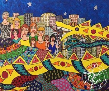 Sa palette de couleurs vive et chatoyante apporte joie et énergie à ses compositions, tandis que ses figures nettes et précises ajoutent dynamisme et contrastes. Son style, à la fois doux et émotionnel, capture l’essence de la vie avec poésie. Depuis 2017, elle expose en France et à l’étranger, multipliant les projets d’exposition. Elle souhaite développer des partenariats, renforcer ses interventions dans les écoles et transmettre ses préoccupations sociales et écologiques aux générations futures.